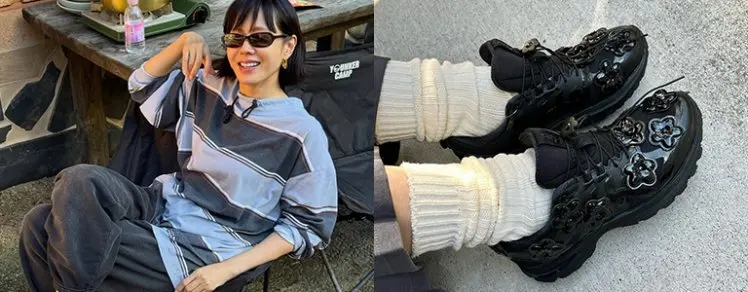 也有人以同色的 Chunky Socks 搭配黑色漆皮運動鞋,極端的兩色碰撞在一起,卻因為襪子的質感亦多了一種溫柔視覺;而且襪子的長度比較長,可以拉下一點營造出「泡泡襪」的效果,讓造型看起來更可愛。